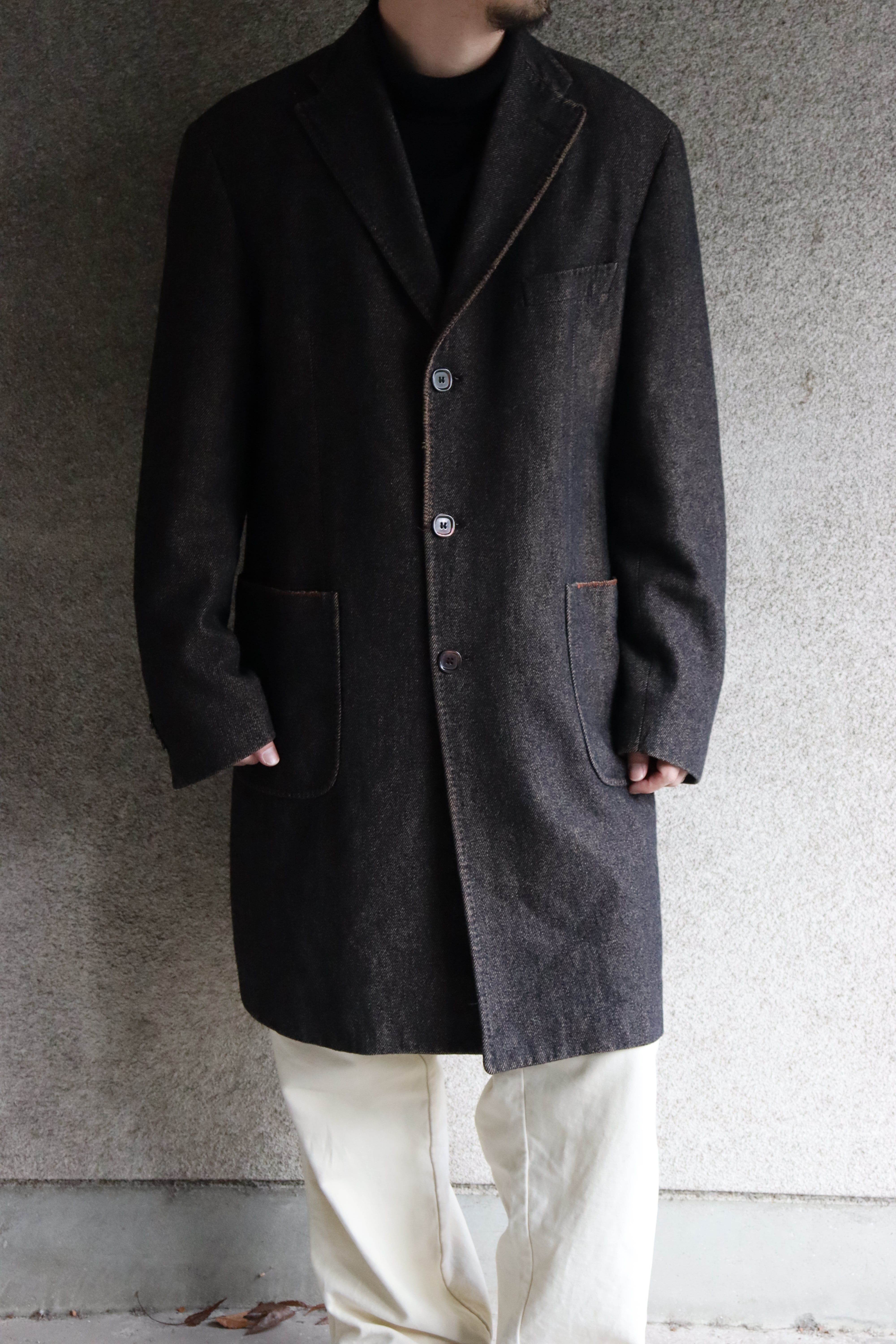 こちらのコートは切りっぱなしのデザインにオレンジのパイピングと襟裏のオレンジのフェルト、遊び心のある一枚です。